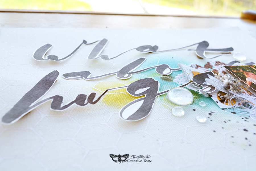 Every word I calligraphed was cut out separately and glued on the layout using little pieces of cardboard to create some interesting depth. I also thought Art Stones and Pebbles would be an interesting touch here.