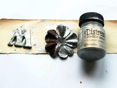 W powyższej pracy najbardziej znaczącymi elementami są kwiaty i litery "spersonalizowane" przeze mnie tak, aby pasowały do "lodowatej" kompozycji. Nie miałam oczywiście w swoich zbiorach gotowych, pasujących dodatków, ale od czego są media? Na warsztacie pojawiły się 3 rózne preparaty - każdy srebrny: Akrylowy Dabber - Srebrny Metaliczny, Pękająca srebrna - Crackle Paint oraz tusz alkoholowy z serii Mixatives - Silver. Każdy z nich jest kryjacy i metaliczny, ale każdy służy do innych zadań specjalnych :) Tutaj zdjęcie pamiątkowe obok przyszłych ofiar...