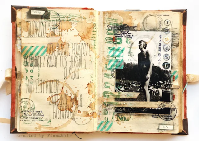 So, here is what I did to the book - I didn't want to cover the beautiful old pages with paint: there were beautiful old stamps, handwritten notes, underlined texts... So I only added a bit here and there!