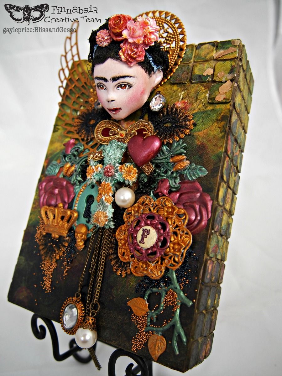 Wow, Gayle - what an amazing piece. I love the textures, metals, hanging trinkets - I love it all! The doll's head looks quite like Frida - and - the colors are wonderful! The piece is gorgeous!