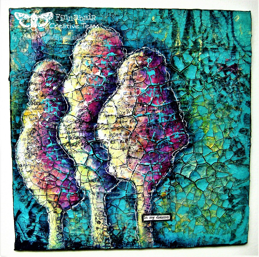 Inspired by the beauty of nature and by Finn’s fabulous products, I created a mixed media painting on a crackle paste covered canvas board, a dreamy clump of trees that I hope youl’ll love.