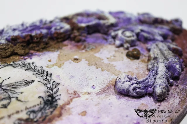 From the time, Finnabair's spring collection was launched I have been craving to mix and match them with the Rust pastes (my all time faves!). I started with a gessoed blank wooden plate and adorned it with paper clay mold designs (using 3D matte gel as adhesive). Next, I carefully primed everything with another gesso layer and added a mix of 3D Matte Gel + Art stones in the nooks & cracks to blend in it into one piece. I used photo transfer technique with a print out from computer and used 3D matte gel. Once dried thoroughly, I added shades from Prima - Art Extravagance - Texture Fantasy - Junkyard Treasures & Northern lights with Prima - Art Extravagance - Rust Effect Paste - Camouflage. I used the darker shades as base and the lighter ones to contour and highlight. These pastes are textured and are of varying consistency and are perfect to create real-rust effects.