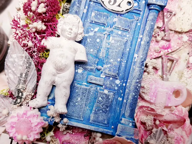 I covered all the resin elements from Finnabair moulds with black gesso, put them in the composition, and began to add colors. I used waxes, liquid acrylics and impasto paints. As you can see, impasto paint works great to bring out small details and structures. Works a little bit like the white gesso.