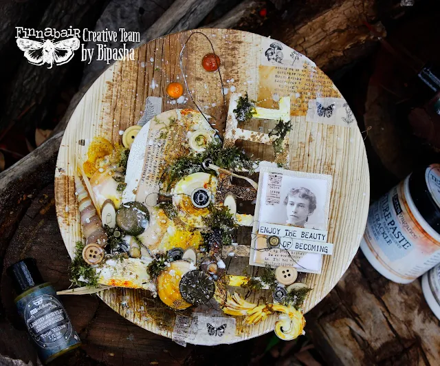 Today I want to share with you a mixed media altered art with the beautiful amalgamation of Finnabair's latest release of metallique acrylics and sparks. I decided to go for a sustainable project with a recycled cane base and all things inspired by nature. At the very outset, I created random textures in my elements and base with Heavy gesso and crackle paste to create the scene. Also prior priming the mdf elements with gesso helped me to add my acrylics on them.