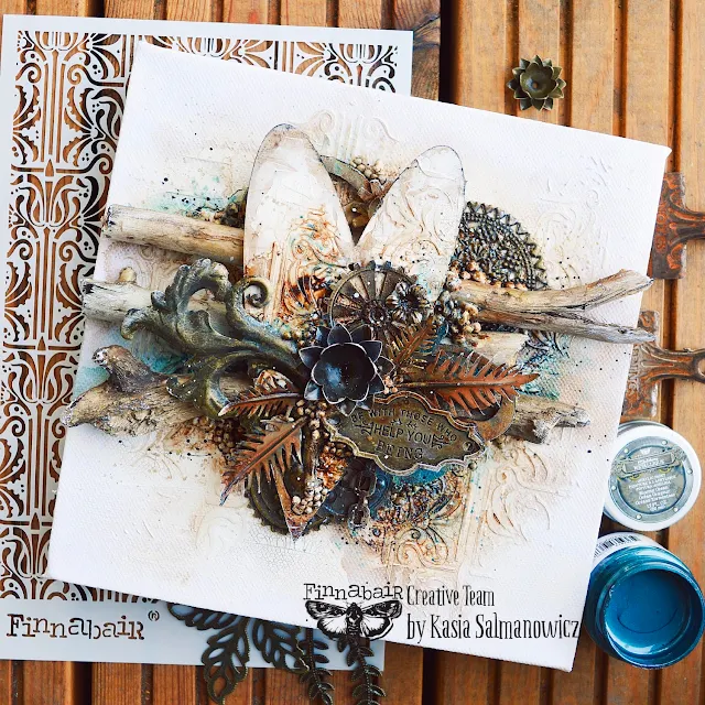 I am in love in changing seasons... each new season brings so much excitement, energy and new ideas to me. And I am so excited for the Autumn time which is greeting us with all its amazing warm colors. This was my first thought when seeing this month’s Art Recipe colors – cobalt, brown and shades of gold. I decided to create a beautiful Autumn treasure house using white crackle paste, Art Alchemy Metallique paints in shades of brown and blue and quite lots of different Metal embellishments.