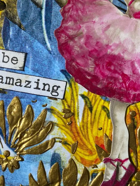 I HAD A LAYER with white gesso all the composition after burn sienna and tiger orange liquids acrylics and to the end black and brown matte wax.to create some highlights I use metallic wax aged brass.Also in some point I add soft matte gel and add some old gold vintage beads