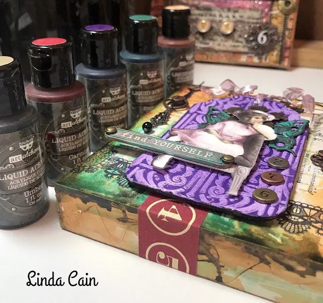 The little girl is glued on over the Steampunk Butterflies, and a Mini Flower. The small numbers and the Find Yourself Antique Label are added last. Then tie a ribbon bow and she’s done.
