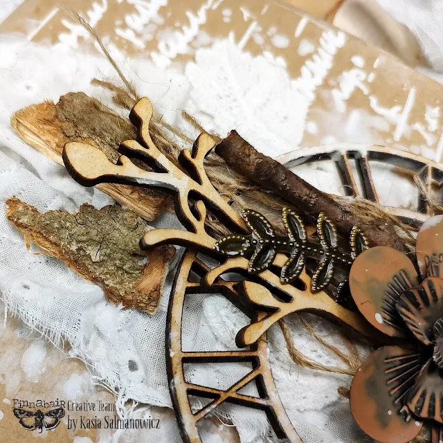 I covered this paper with Clear Gesso and dried it. Later I started sticking fabrics. For gluing the entire project, I chose Heavy Body Gel and 3D Matt Gel. I used them alternately depending on what additives I was sticking on. I also added decorative HDF accessories and metal embellishments from Finnabair. I love these new flowers designed by Finn;)