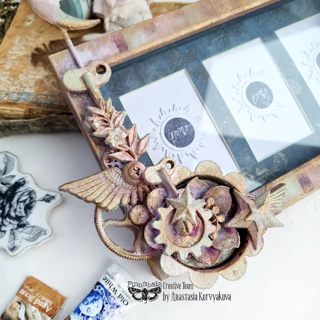 I chose moulds from different sets and combined them with metal embellishments into two compositions. I covered all with White Gesso, applied Soft Satin Metallic Acrylic Paint on the back of the frame and started to work with the front of the frame.
