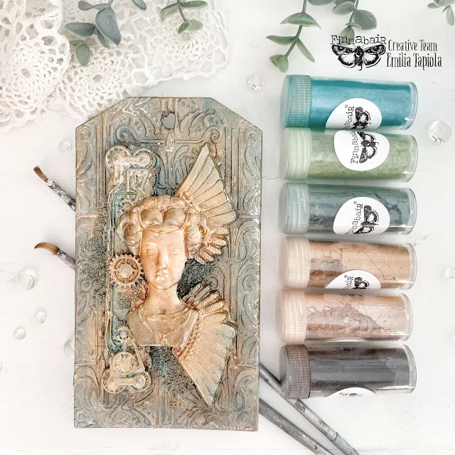 Hi creative friends! The Golden Hour Mica Powder set was the 2nd one I wanted to try immediately when I saw new release. I created something that I called Artifact, using various Mechanicals and moulds. I glued all elements together with Heavy Body Gel and applied Black Gesso.